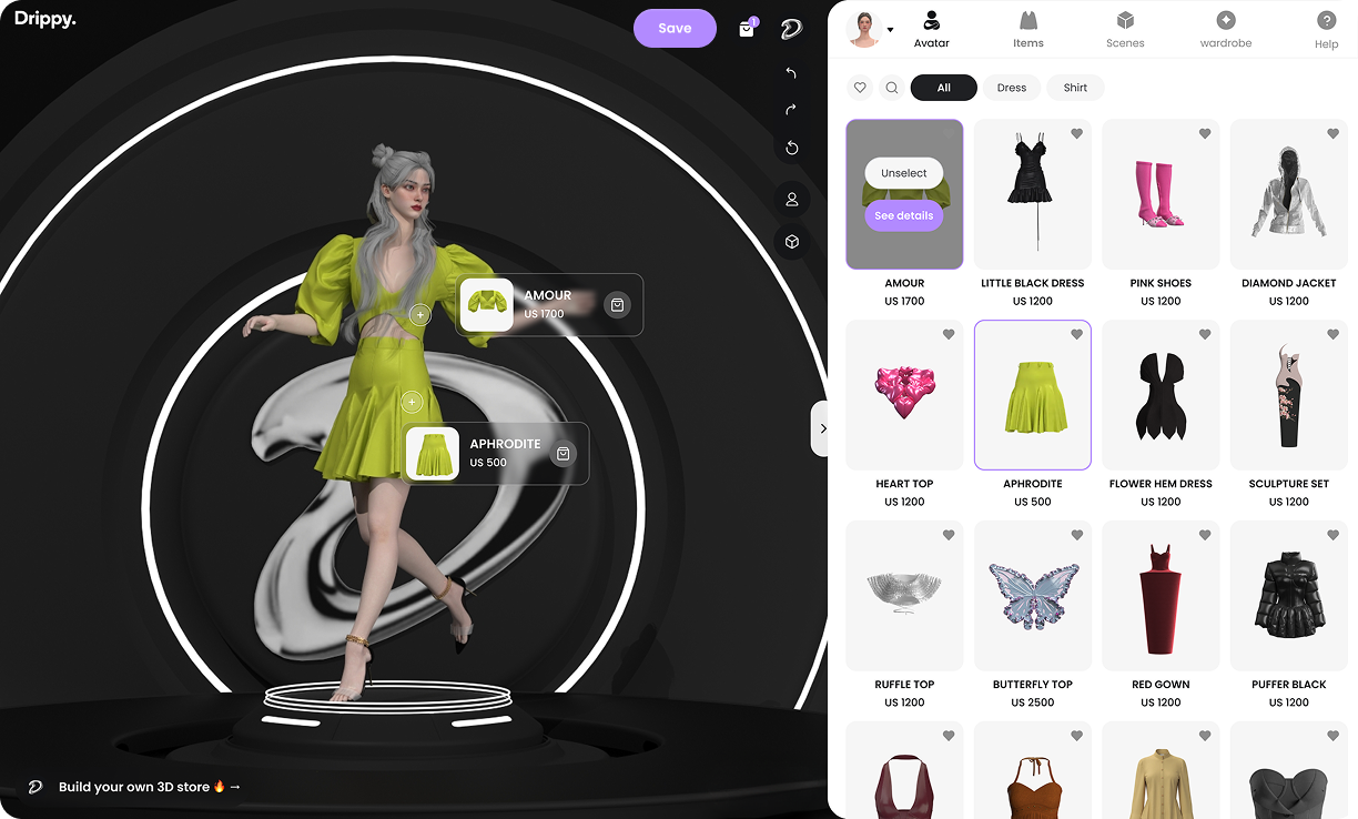 Drippy is a 3D dressing “game" on the browser that is shoppable IRL.